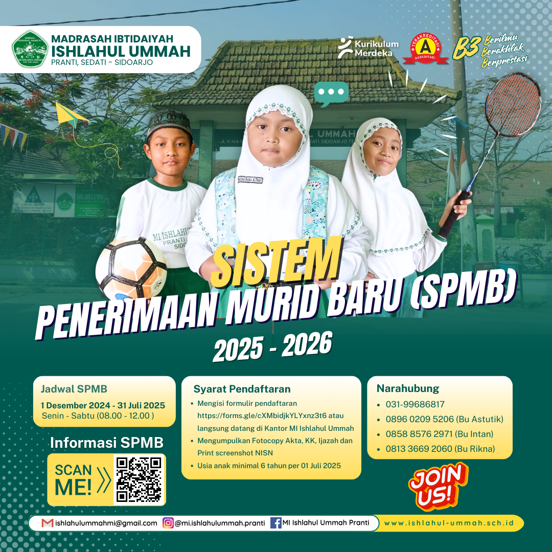 MI Ishlahul Ummah Pranti resmi membuka Pendaftaran Peserta Didik Baru (PPDB) untuk tahun ajaran 2025/2026. Pendaftaran dibuka mulai 1 Desember 2024 hingga 31 Juli 2025,…